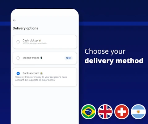 With Xe, you can choose from multiple payout methods for your recipient to receive your money transfer, including bank deposit, cash pickup, and mobile wallet. Send money directly to hundreds of major banks worldwide, or have cash picked up at over 500,000 convenient locations across more than 150 countries. Xe ensures your funds are delivered securely, allowing you to make mobile payments directly to major mobile wallets in over 35 countries, providing flexible options for your international transfers.
